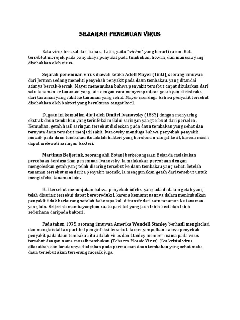 Sejarah penemuan virus terjadi pada 1883. Ia melakukan penelitian pada tanaman tembakau. Sejarah penemuan virus dimulai tahun 1883 oleh ilmuwan jerman yang bernama adolf meyer. Virus ditemukan pertamakali oleh ilmuwan jerman, adolf mayer, pada tahun 1883 ketika sedang meneliti penyebab penyakit mosaik pada tanaman . Apa kesimpulan adolf meyer setelah mengamati daun tembakau yang sakit dengan mikroskop biasa dan ia tidak dapat menemukan bakteri penyebab penyakit tersebut . Saat itu, ilmuwan asal jerman adolf mayer . Setelah diteliti bintik kuning tersebut . Virus pertama kali ditemukan di akhir abad 19, yaitu di tahun 1882. Seorang ilmuwan jerman, adolf mayer sedang mencari penyebab penyakit mosaik pada tembakau. Virus dalam pengertiannya di bidang biologi dan kesehatan pada awalnya diungkap oleh seorang jerman bernama adolf mayer.